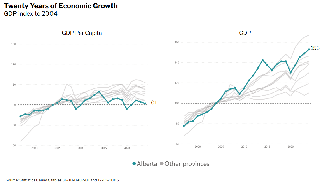 What’s different in Alberta is how long this has been going on. Since oil prices crashed in 2014, the province’s per capita GDP hasn’t just stalled—it’s fallen. It’s now down around 10% compared to 2014 and sits at the same level it did 20 years ago. The economy may be larger, but it isn’t stronger—with weaker income growth and higher unemployment.