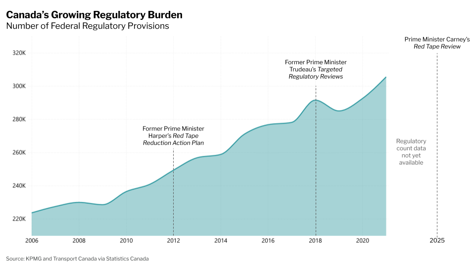 From Prime Minister Harper’s Red Tape Reduction Action Plan to Prime Minister Trudeau’s Targeted Regulatory Reviews (which are still ongoing) to Prime Minister Carney’s Red Tape Review, successive governments have all had their “red tape moment.” Yet it’s hard to find any proof in the pudding.