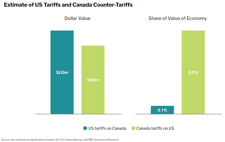 A key limitation for Canada in deciding by how much to retaliate is the size of the U.S. economy. A tariff war between the two countries will hurt Canadians more than Americans. Even though their dollar value is roughly similar, U.S. tariffs on Canadian goods are equivalent to just 0.1% of the American economy, while our counter measures are ten times larger when measured against the size of ours.