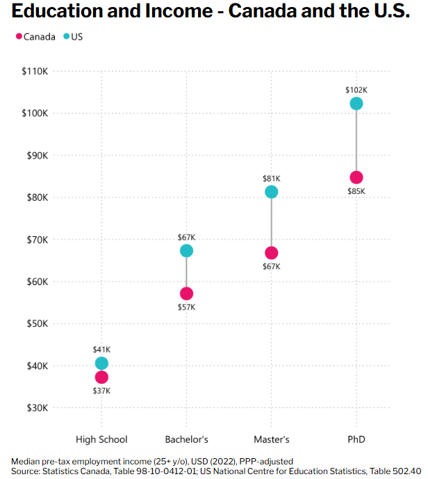 Things don’t look better at higher levels of education either. Canadians with master’s degrees fail to outearn Americans with bachelor’s degrees. So technically, it may be a better investment for a Canadian to pursue immigration to the U.S. rather than a master’s degree in Canada. Similarly, all the work of getting a PhD earns a Canadian only $3,500 more each year than an American with a master’s degree.