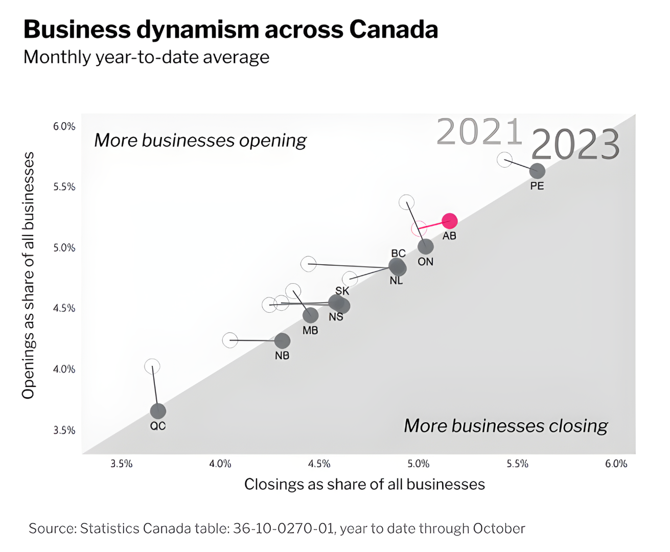 - However, Alberta stands out as one of the only provinces with a modest increase inbusinesses opening in 2023 compared with 2021 and, likewise, has a slight edge in openings over closing: 5.22% versus 5.16%, respectively.